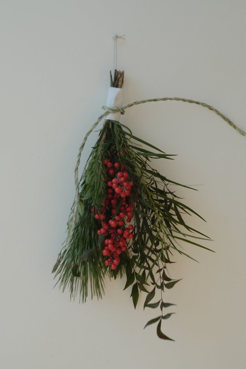 無農薬の真菰と山の植物、庭の草木の姿をそのままにお正月飾りに仕立てます。