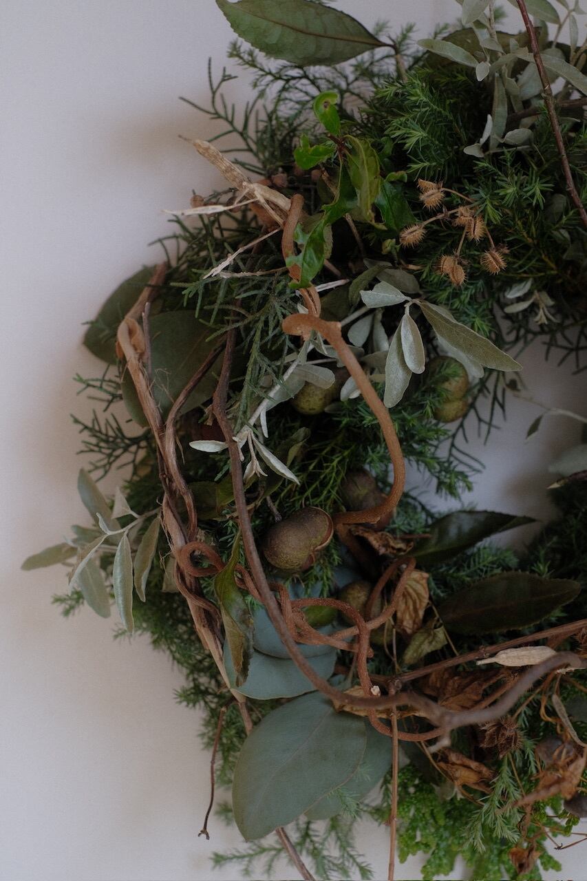 曲がりくねった枝や太さの異なる幹、自然のサイクルでできた種、植物たちが重なり合い、ひとつの輪となって暮らしをやさしく彩ります。古くからクリスマスリースには「家を守る魔除け」の意味があり、常緑の針葉樹や実を飾ることで、来年の豊穣と幸福を祈願してきました。終わりのない輪のかたちは、愛としあわせが途切れず続く象徴でもあります。屋内に飾っていただくとより長く美しく保てますが、屋外に飾る場合は、雨や風を避けられる場所にお掛けください。