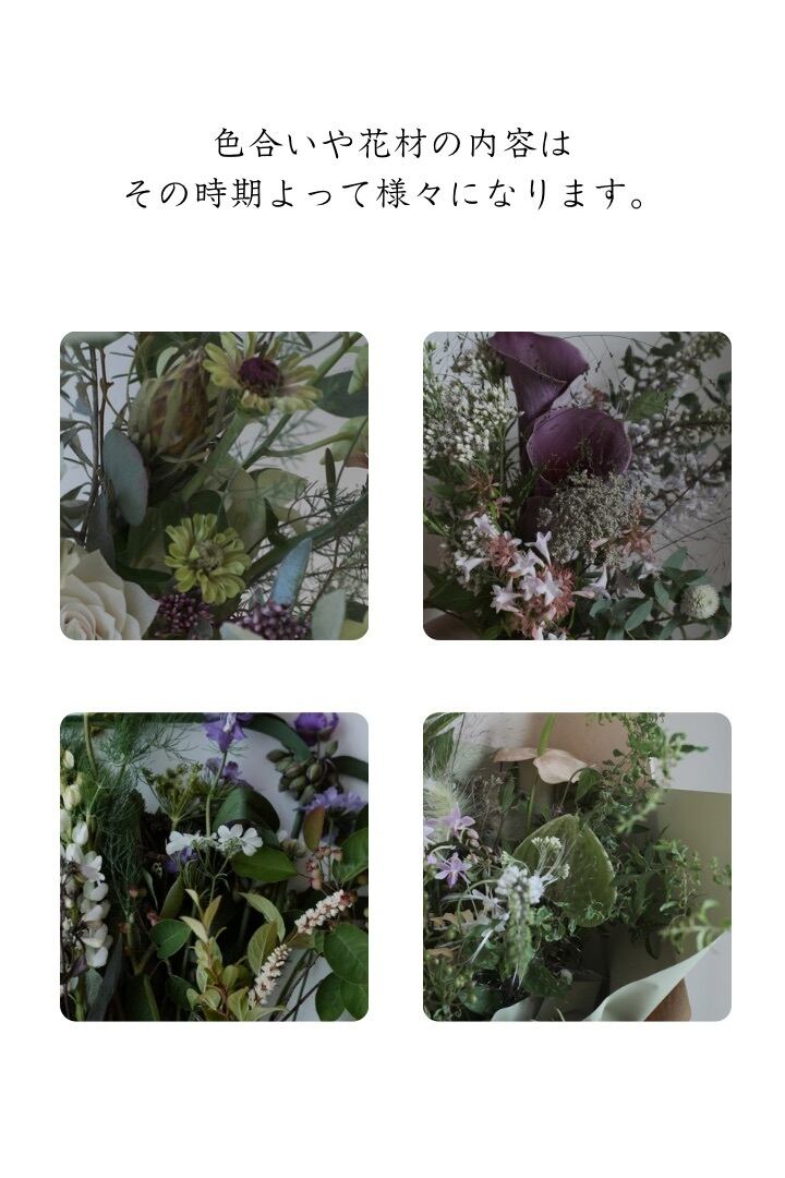 その季節の旬の草花をおまかせでご用意したセットです。ひとつひとつの草花が持つ個性やいのちの輝きを感じながら、今その瞬間にしか出会えない表情をお届けします。花束ではなく、切り花セットとなりますので、ご自宅用におすすめです。