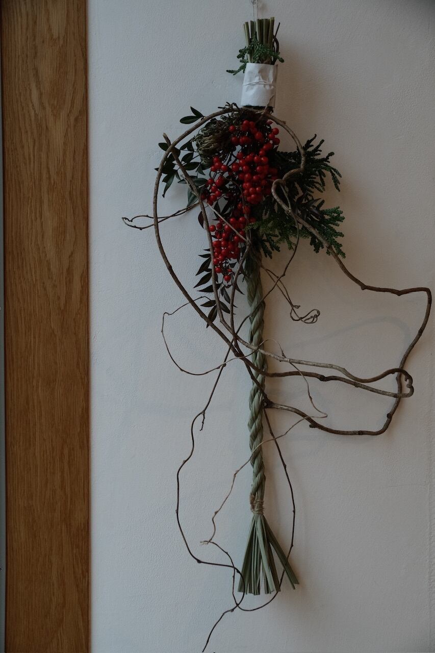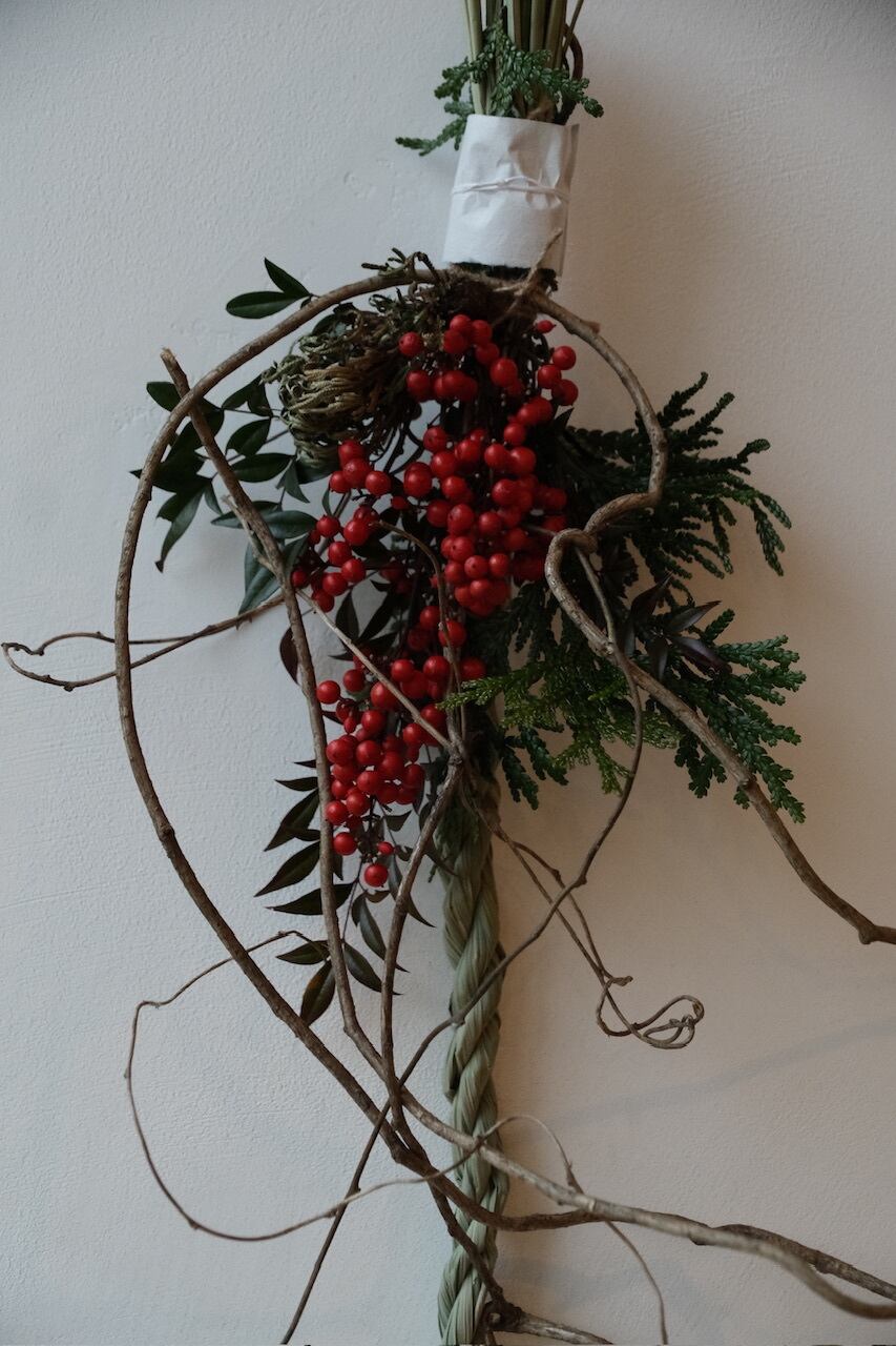 赤い南天は、「難を転じて福を招く」とされる縁起の良い植物。自然の恵みである草木たちが織りなす飾りは、生命力あふれる新年を迎えるためのエネルギーを与えてくれます。作品によって入る草木がそれぞれ違うのも楽しんでいただければと思います。