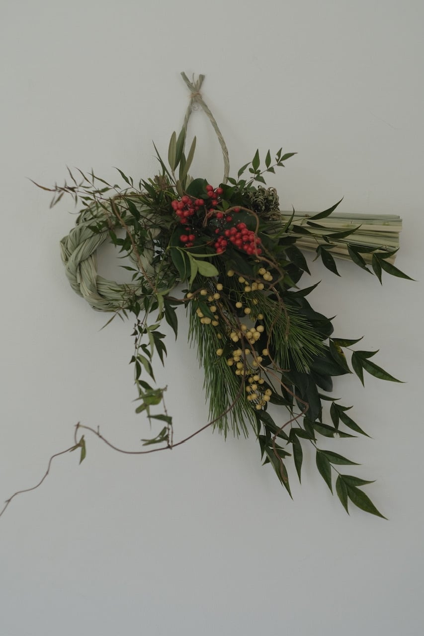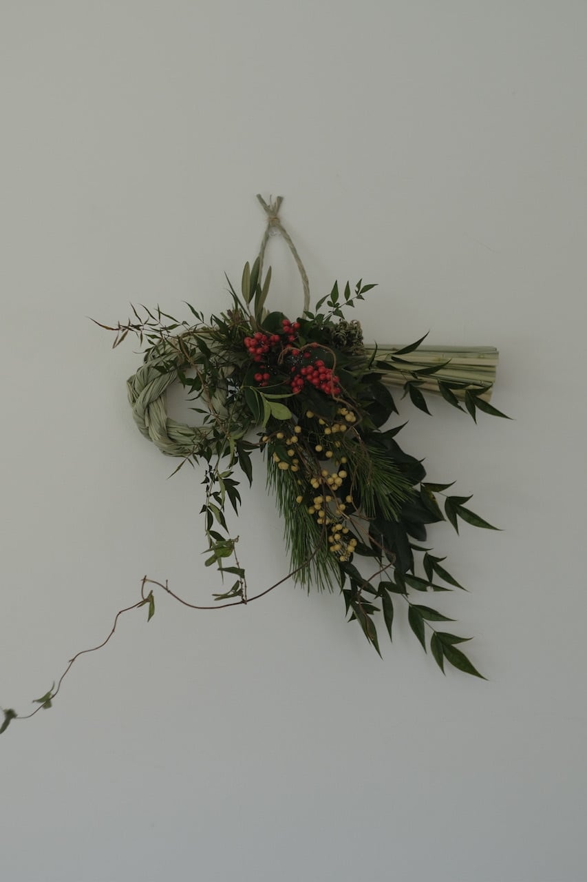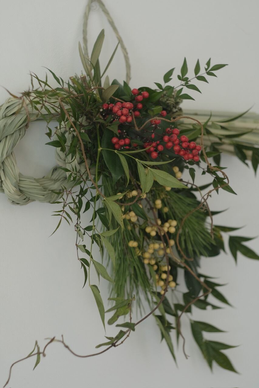 赤い南天は、「難を転じて福を招く」とされる縁起の良い植物。自然の恵みである草木たちが織りなす飾りは、生命力あふれる新年を迎えるためのエネルギーを与えてくれます。作品によって入る草木がそれぞれ違うのも楽しんでいただければと思います。